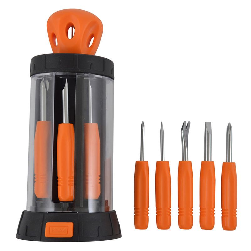 Práctico set de 8 piezas, que incluye 6 destornilladores, un punzón y una palanca. El kit viene en un práctico organizador para que para que tengas toso ordenado y siempre a mano. Con puntas en acero inoxidable, este práctico kit ofrece precisión y durabilidad.