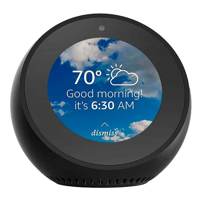 Echo Spot se conecta a Alexa, un servicio de voz basado en la nube para reproducir música, leer las noticias, contestar, preguntas, controlar el hogar inteligente, y más.