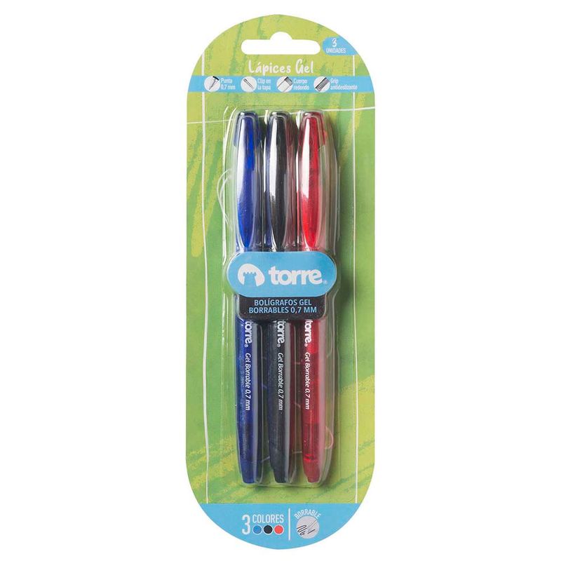 Bolígrafos TORRE en gel borrable color azul, rojo y negro 3 un.