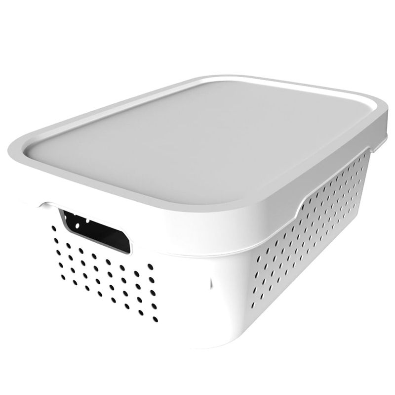 La caja organizadora de 11 litros de color blanco tiene medidas de 40.5 x 28 x 14 cm. Ideal para mantener ordenado tu hogar u oficina. Cuenta con tapa y asas para facilitar su transporte. Perfecta para guardar ropa, juguetes, documentos y otros objetos. ¡Mantén todo en su lugar!