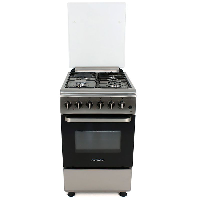 La Cocina Combinada FUTURA PLUS Mod. FUT-50-C31X Ibiza Inoxidable es un electrodoméstico versátil y moderno. Incorpora tres quemadores de gas y un horno eléctrico con grill, en un diseño compacto y elegante de acero inoxidable. Posee encendido electrónico, puerta de horno desmontable y termostato regulable.
