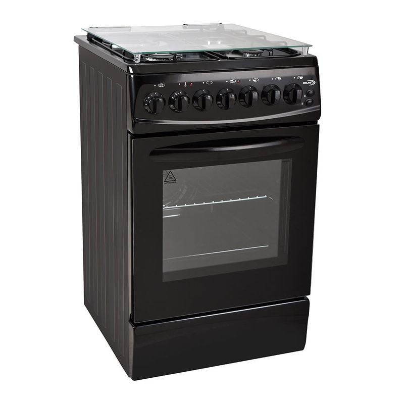 La cocina eléctrica Delne es un electrodoméstico de alta calidad con encendido eléctrico, timer, luz, asadera y parrilla, y una capacidad de 46 litros. Es adaptable a gas natural y está disponible en un elegante color negro.