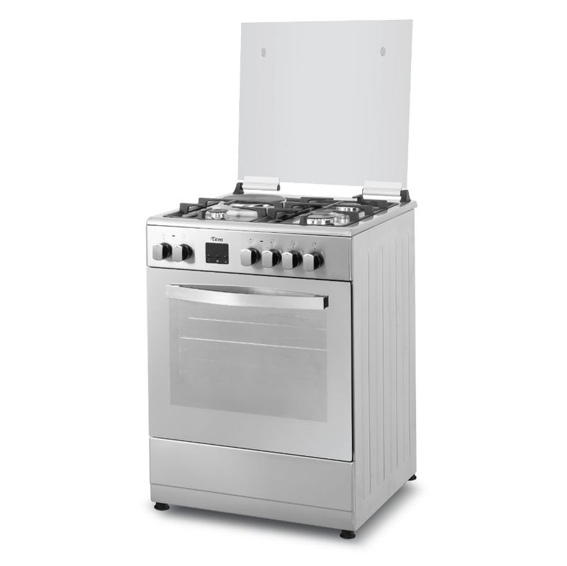 Cocina TEM T1MCC4H Mod. Carmela. Combinada, acero inoxidable, horno eléctrico con convección multifunción Turbo,con capacidad de 63L, 3 hornallas a gas + 1 disco eléctrico. 2 rejillas y 2 bandejas de horno rejillas en hierro fundido, encendido eléctrico para hornallas, Luz de horno.