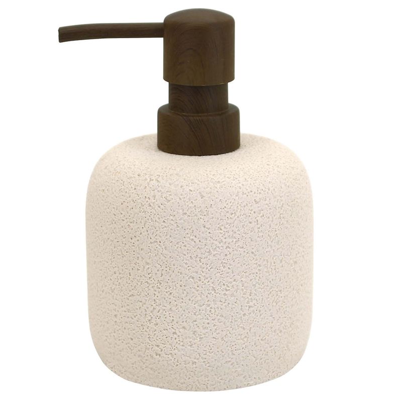 Dispensador de jabón en poliresina beige con detalle de madera, fusiona elegancia y naturalidad. Ideal para baños modernos, su diseño funcional aporta un toque cálido y estilizado al espacio.