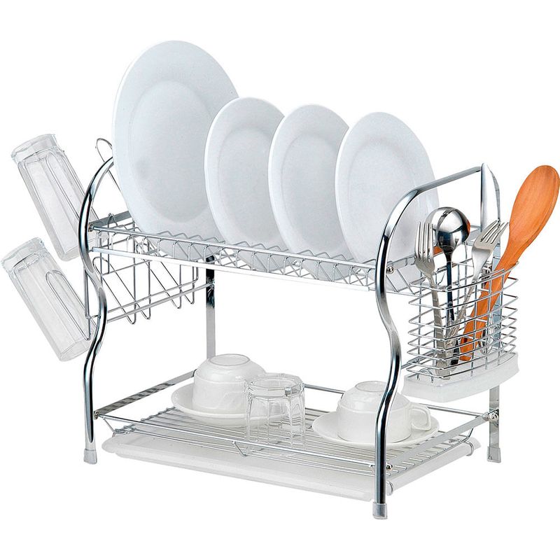 Práctico escurridor de dos pisos en acero con terminación cromada. Dimensiones 54.8 x 25,7 x 35.5 cm.