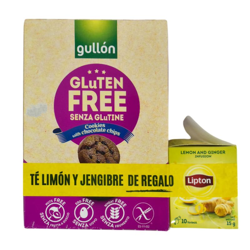 Deliciosas galletitas Gullón sin gluten con chips de chocolate, presentadas en un paquete de 200 gramos acompañadas de 10 saquitos de té Lipton. El complemento perfecto para disfrutar de un sabroso tentempié sin preocupaciones. ¡Una combinación irresistible para cualquier momento del día!
