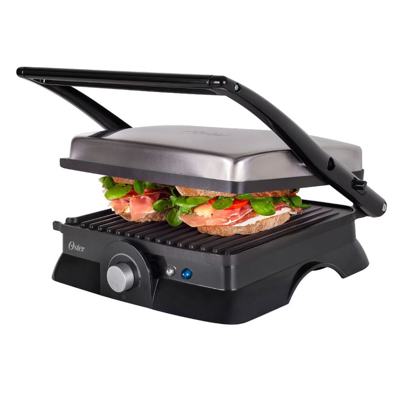 Grill eléctrico multiuso OSTER OS-GRL210. Potencia 1500w.Tiene 10 niveles de temperatura de 170°C a 230°C. Placas antiadherentes. Garantia 1 año