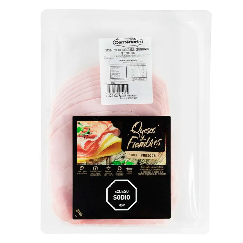 El jamón cocido extra etiqueta azul centenario feteado es un producto elaborado con carne de cerdo seleccionada y curada al vacío. Tiene un sabor suave y delicado, con un toque ahumado.