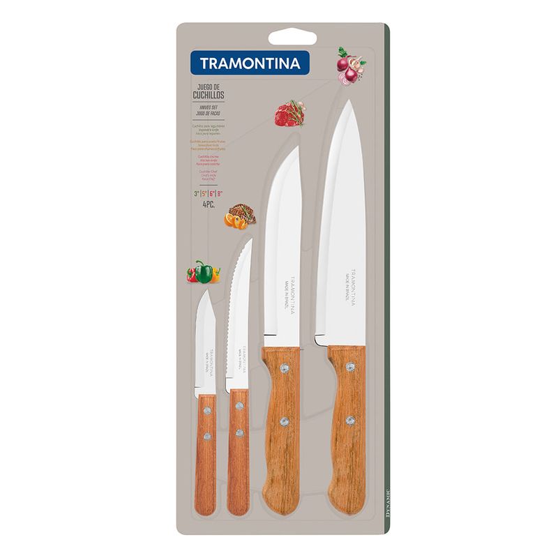 El juego de cuchillos TRAMONTINA 4 piezas ofrece calidad y versatilidad en la cocina con cuchillos de acero inoxidable y un diseño elegante.