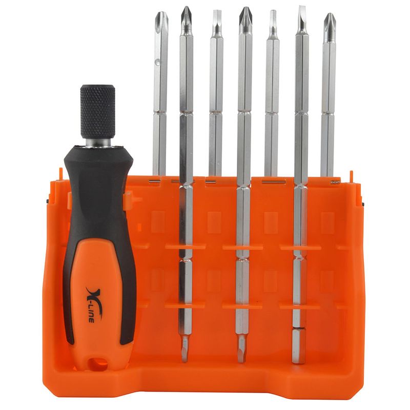 Práctico destornillador de 8 piezas. Este destornillador, cuenta con 7 puntas intercambiables, que al rotarlas cambia el tipo de punta, dando un total de 14 opciones de destornillador. Es ideal para el hogar ó para llevar en el auto. Con este práctico set, tenga siempre a mano el destornillador que necesita. Con mango recubierto en goma antideslizante y puntas en acero inoxidable, este práctico kit ofrece firmeza, precisión y durabilidad.