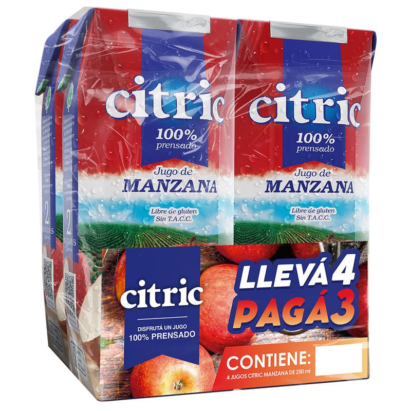 El Jugo CITRIC manzana, pack 4x3 de 1 L, es un paquete de 12 unidades de jugo de manzana de 1L cada una. Este producto de CITRIC ofrece un sabor auténtico y fresco de manzana, sin aditivos ni conservantes, perfecto para disfrutar en cualquier momento del día.
