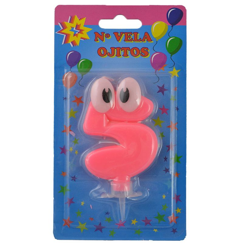 Número 5 con ojos rosados + portavela de plástico. ¡Producto de excelente calidad!