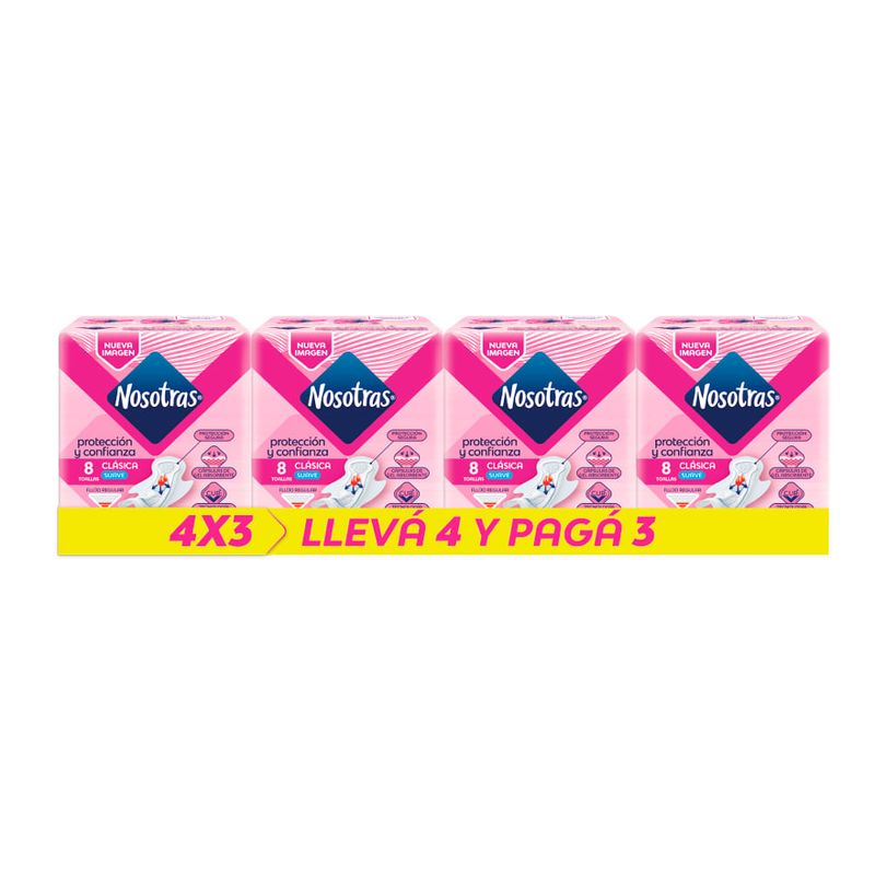 El pack de 4 x 3 toallas femeninas Nosotras Invisibles incluye 8 unidades por paquete. Son ultradelgadas y altamente absorbentes para máxima comodidad. Su diseño invisible garantiza discreción y se adapta a tu cuerpo, y su cubierta suave evita irritaciones. Producto hipoalergénico.