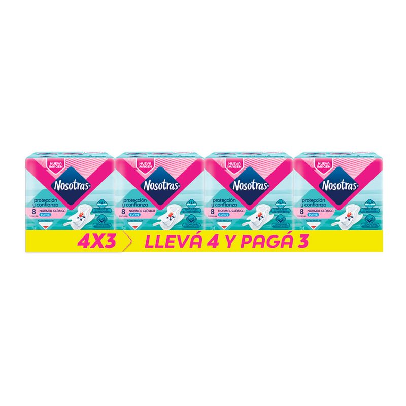 El Pack 4 x 3 de toallas femeninas Nosotras normal incluye 32 unidades distribuidas en 4 paquetes. Estas toallas ofrecen una protección eficaz y cómoda durante tu período, ayudando a evitar fugas gracias a su gran capacidad de absorción. Su diseño garantiza un ajuste seguro y discreto.