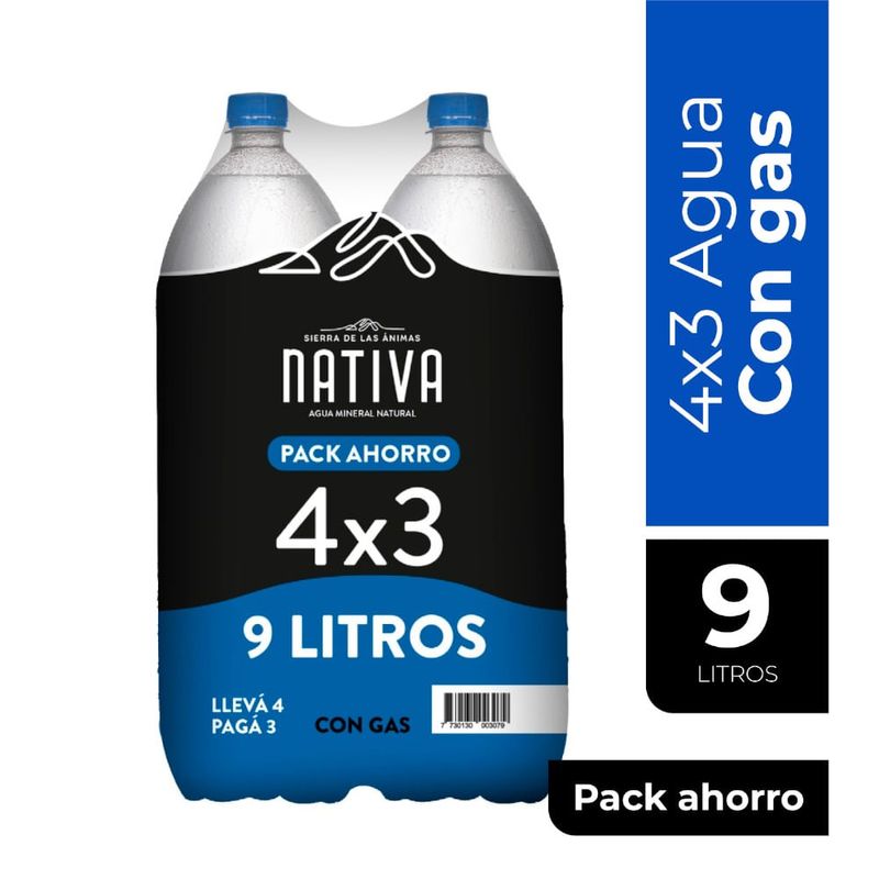 El pack de agua NATIVA con gas incluye 4 botellas de 2.25 L cada una. Ideal para la hidratación diaria o acompañar comidas