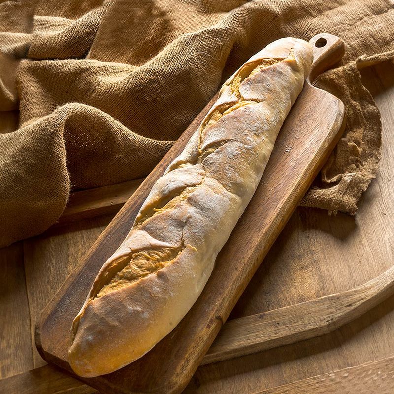 Delicioso Pan Flauta MASAMADRE, horneado a la perfección con masa madre natural. Su textura crujiente por fuera y esponjosa por dentro lo hace irresistible.