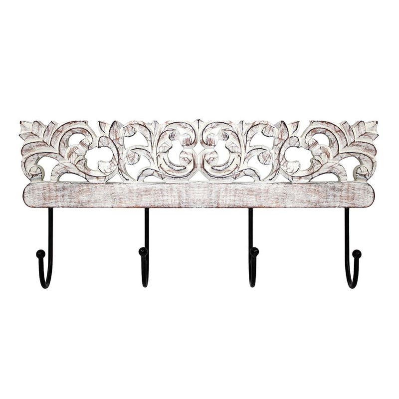 Perchero en madera labrado 40x18 cm 4 ganchos blanco