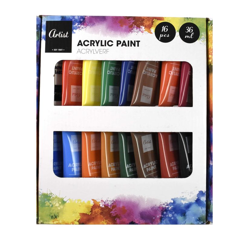 Pintura acrílica 16 tubos de 36 ml c/u, producto de excelente calidad.