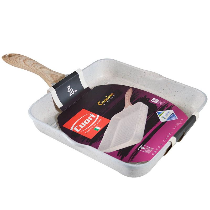 Plancha CUORI 28x28 cm antiadherente línea Cuccina. Aluminio fundido, interior antiadherente y mango de silicona suave al tacto. Apto para inducción. Producto de calidad.