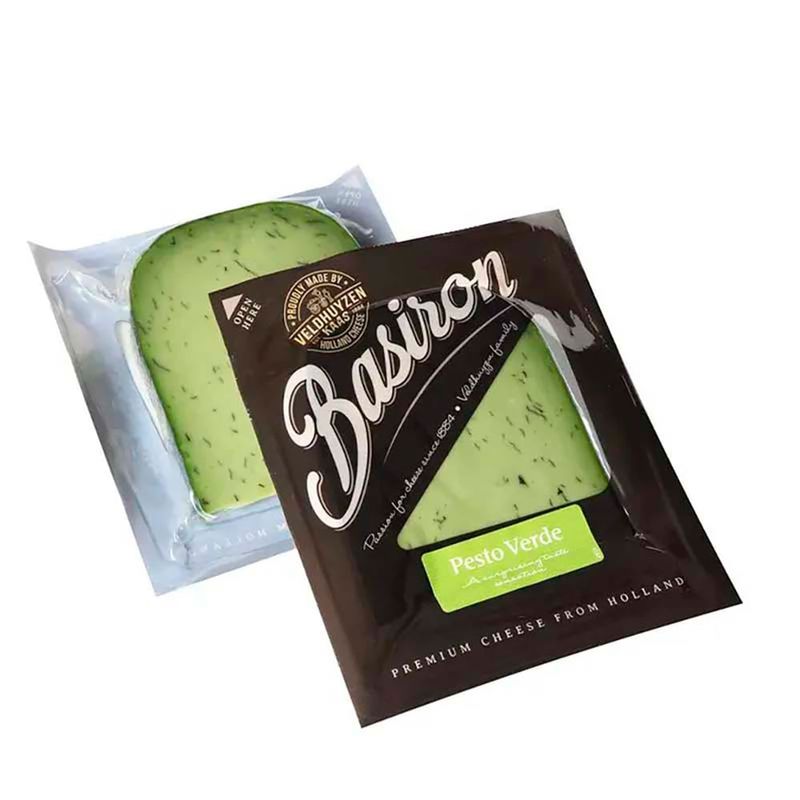 Queso Basiron Pesto Verde: Deliciosa fusión de queso de alta calidad con el fresco y vibrante sabor del pesto verde. Una experiencia culinaria única y llena de exquisitez en cada bocado.