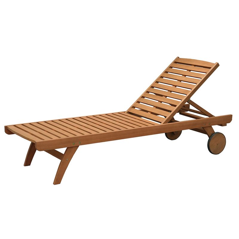 Reposera madera eucalyptus con ruedas 190x62x35/89 cm. Este artículo se vende en caja, el armado no está incluido, usted puede contactar a un armador externo llamando a nuestro servicio de Atención al Cliente. El artículo ofrecido es el que corresponde a la descripción, cualquier accesorio es meramente ilustrativo.
