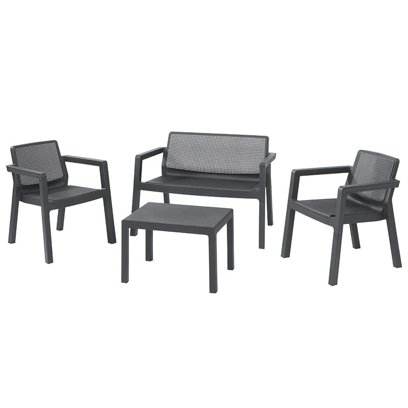 Siéntate y relájate en el conjunto de muebles Emily de 4 plazas gracias a su diseño moderno y ergonómico. Emily incluye 2 sillones, un sofá de 2 plazas y una mesa decorativa. Con un elegante acabado de red, la construcción duradera, resistente a la intemperie y que no se decolora también es fácil de mantener y se verá bien temporada tras temporada._x000D_