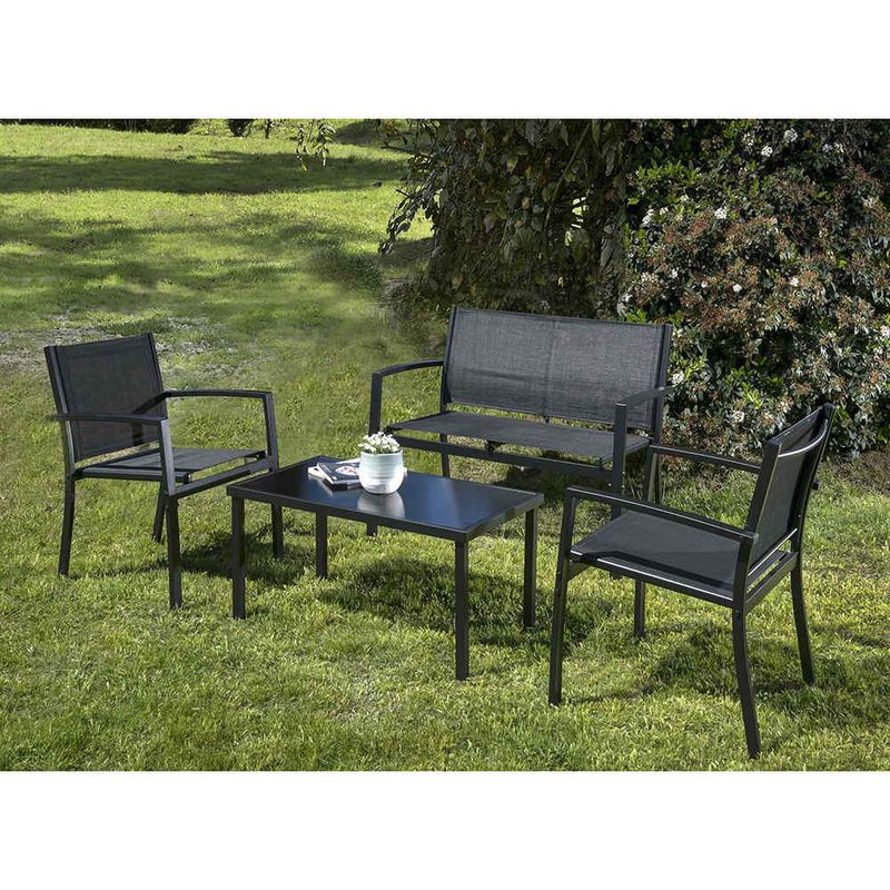 Set acero y textilina 4 piezas jardín color negro. Medidas (cm): Silla single 62,5*60*78, silla doble 62,5*107*78, mesa baja 90*50*41. Este artículo se vende en caja, el armado no está incluido, usted puede contactar a un armador externo llamando a nuestro servicio de Atención al Cliente. El artículo ofrecido es el que corresponde a la descripción, cualquier accesorio es meramente ilustrativo.