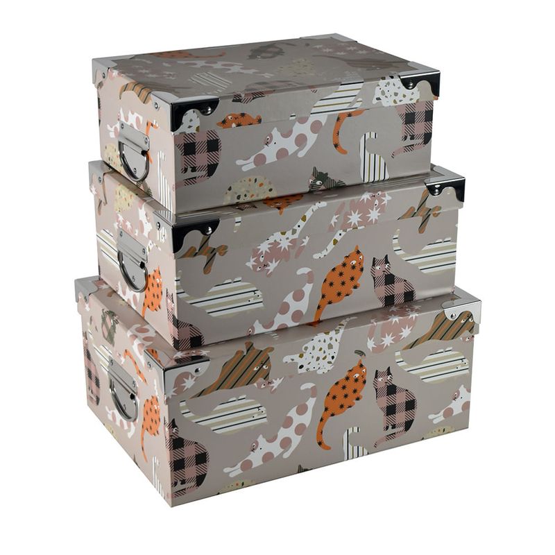 Organiza con encanto y diversión. Este conjunto de tres cajas presenta un adorable diseño de gatos, ideal para añadir un toque lúdico a tu organización. Perfecto para almacenar una variedad de artículos en el hogar, la oficina o cualquier espacio donde se busque funcionalidad con estilo.