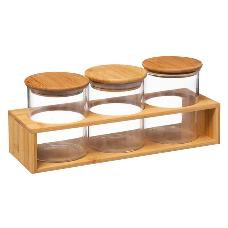 Set x3 condimenteros vidrio 40 ml con soporte de bambú