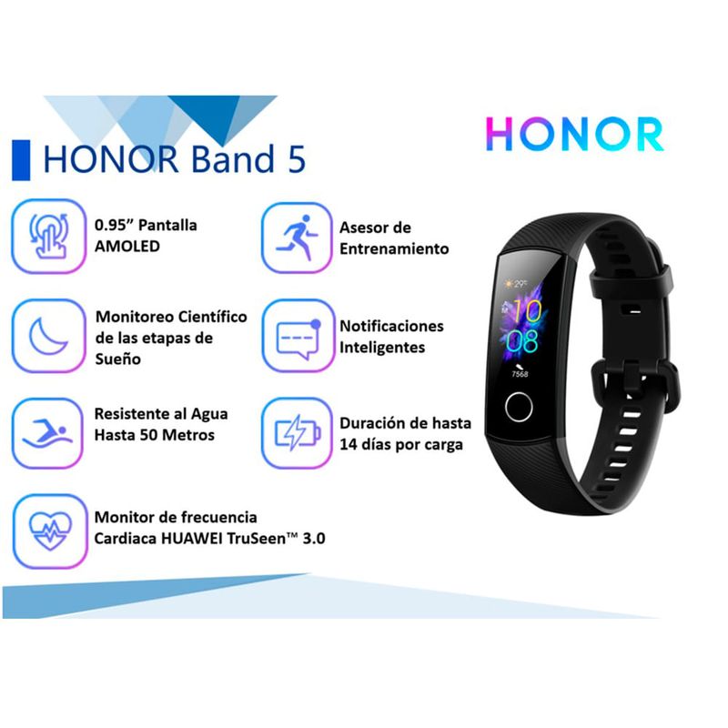 HONOR band 5 Pantalla táctil Amoled 0.95". Sensores de sueño. Frecuencia cardíaca y saturación de oxígeno en sangre. Resistente al agua hasta 50 m. Reconocimiento de actividades: Natación, Ciclismo, Caminata y Carreras. Visualiza Llamadas, mensajes y notificaciones