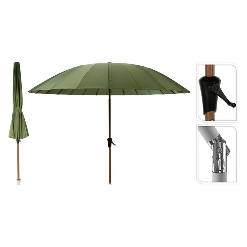 Sombrilla Shanghai de 265 cm en color verde. Ofrece amplia sombra y elegancia a cualquier espacio exterior. Diseño robusto y duradero, ideal para jardines, patios y terrazas. Fácil de instalar.