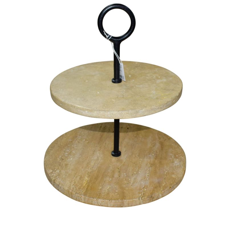 Este soporte de dos pisos destaca por su elegancia y resistencia, con platos elaborados en mármol travertino, conocido por su durabilidad y belleza única. Perfecto para servir aperitivos o como elemento decorativo, aporta un toque sofisticado y natural a cualquier ambiente.