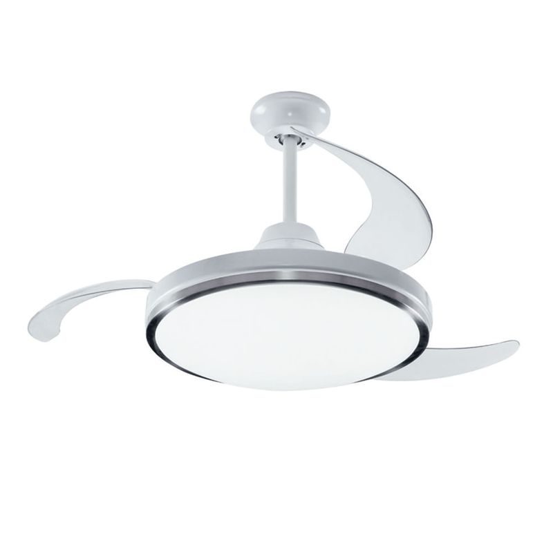 Detalles: 100W de potencia (35W luz + 65W motor); 3 paletas retráctiles invisibles; 3 tipos de luz: Fría, blanca cálida y amarilla cálida; Control remoto con temporizador y 3 velocidades; Timer; Bajo consumo y silencioso; Cuerpo de acero inoxidable y aspas de acrílico; Dimensiones: Cerrado 51 cm / Expandido: 106 cm (42”); Sin necesidad de cableado extra para el motor; Apto para tecla de luz; Origen: China.